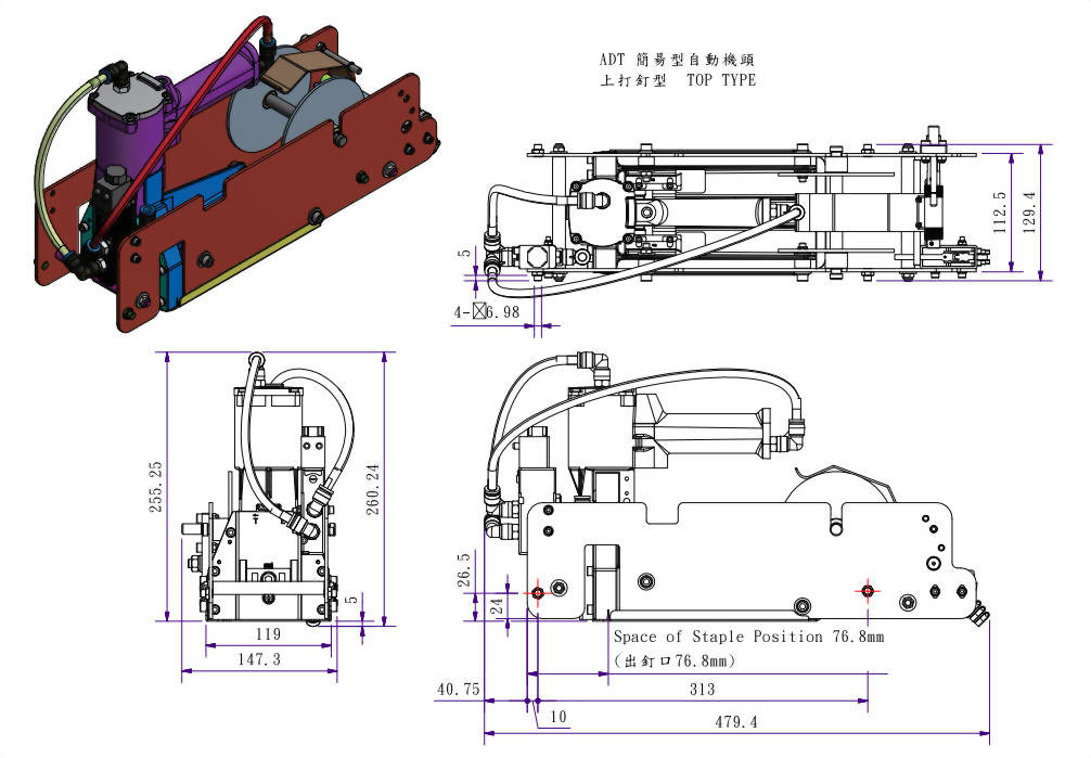 長 : 479 mm 寬 : 148mm 高 : 260 mm 重 : 5.7kgs 工作氣壓 : 5〜7 bar |